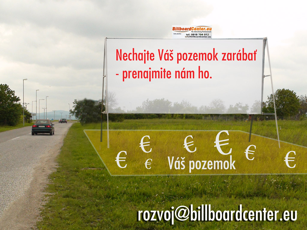 Máme záujem o prenájom Vášho pozemku, susediaceho s pozemnou komunikáciou, v blízkosti obchodného, prípadne office centra, kde prevláda čulý denný ruch alebo na verejnom priestranstve v centre mesta/obce, na umiestnenie reklamného panelu. Zaujímajú nás aj steny Vašich rodinných domov a plotov.